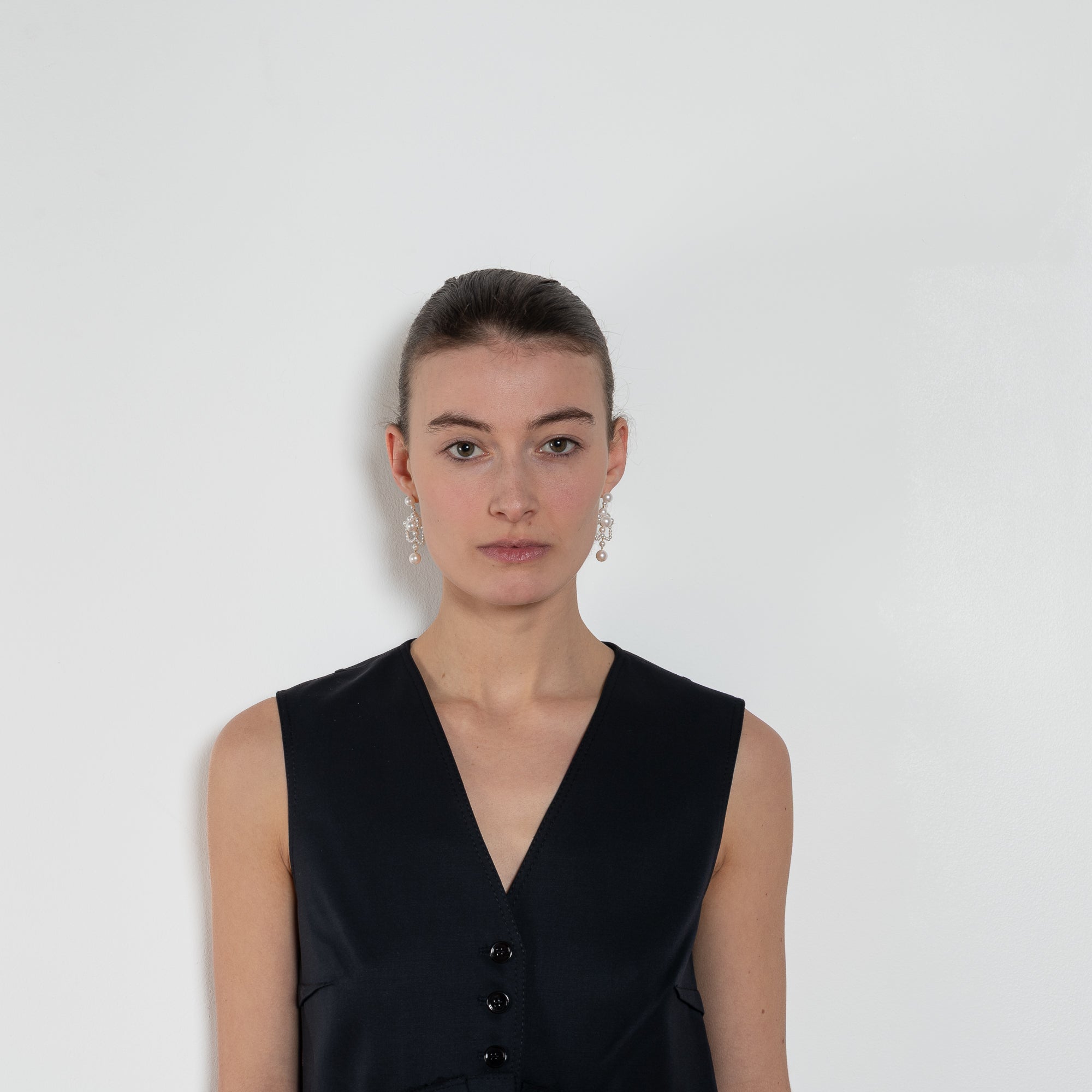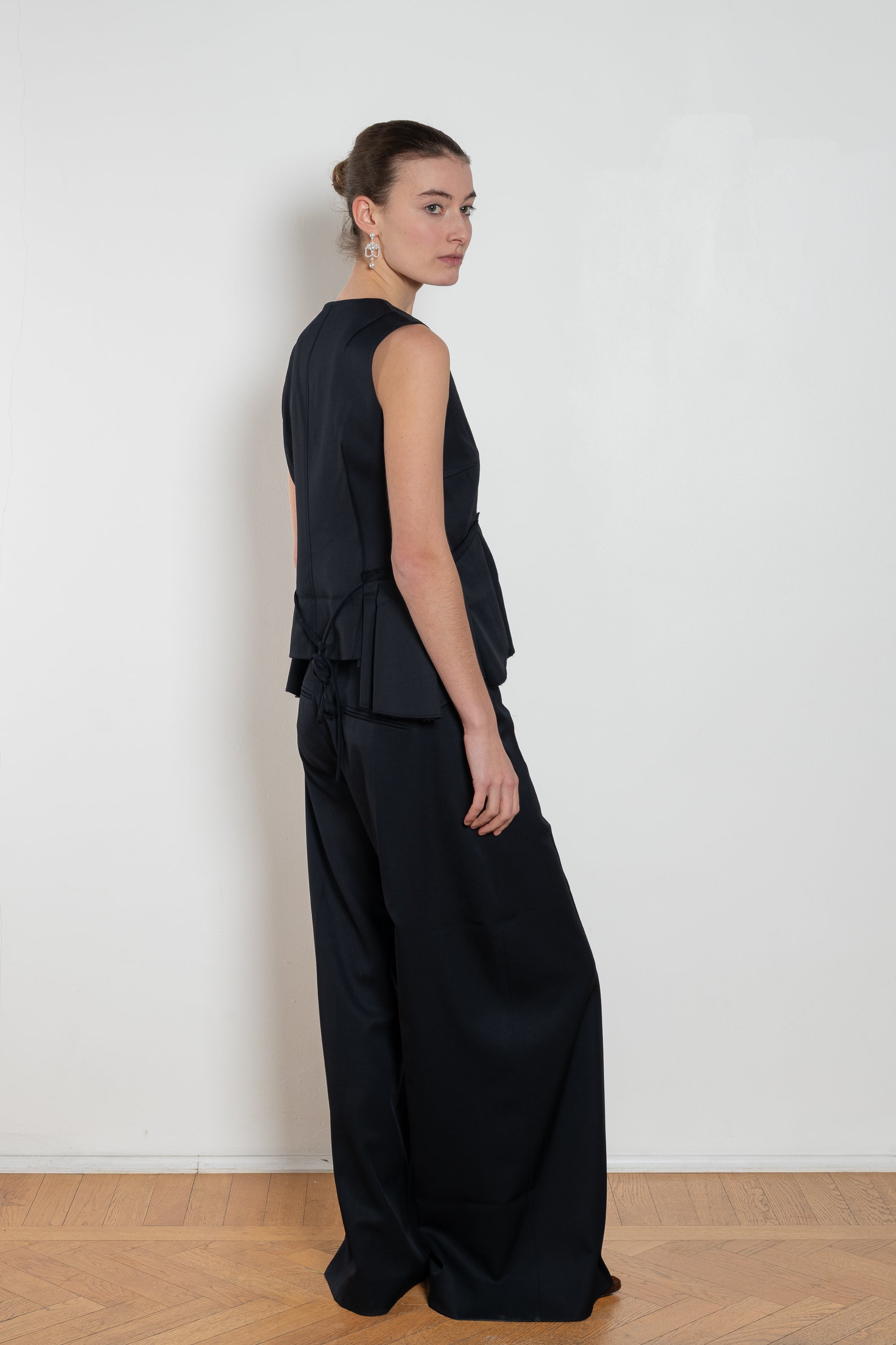 The Bang Bang Vest by Nackiye is a button pleated deconstructed vest with back tie for a tighter fit. Raw hemming at the waist with side pleating.