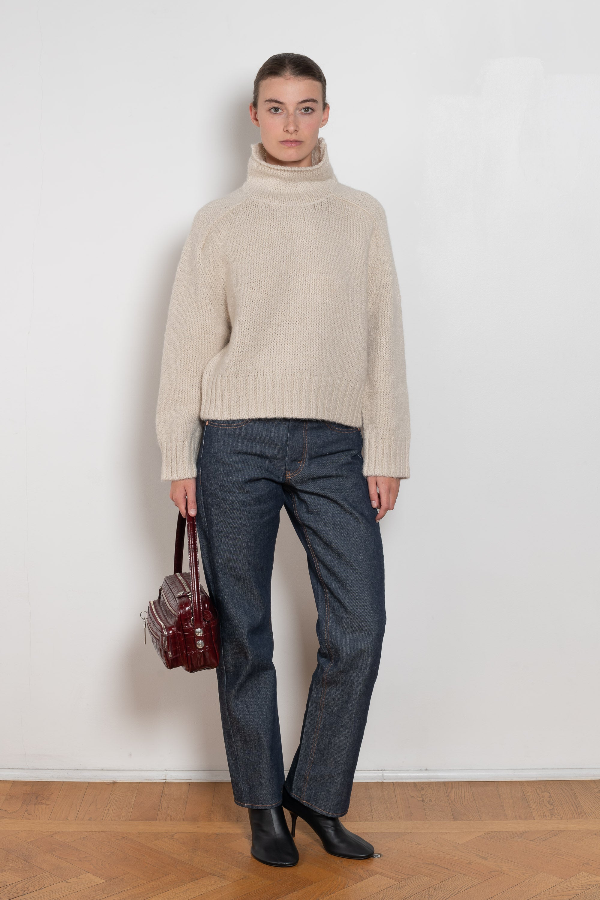 The Kean Stand Collar Sweater by Loulou De Saison features a straight fit, a stand collar, drop shoulders and thick ribbed details along the hem and the cuffs.