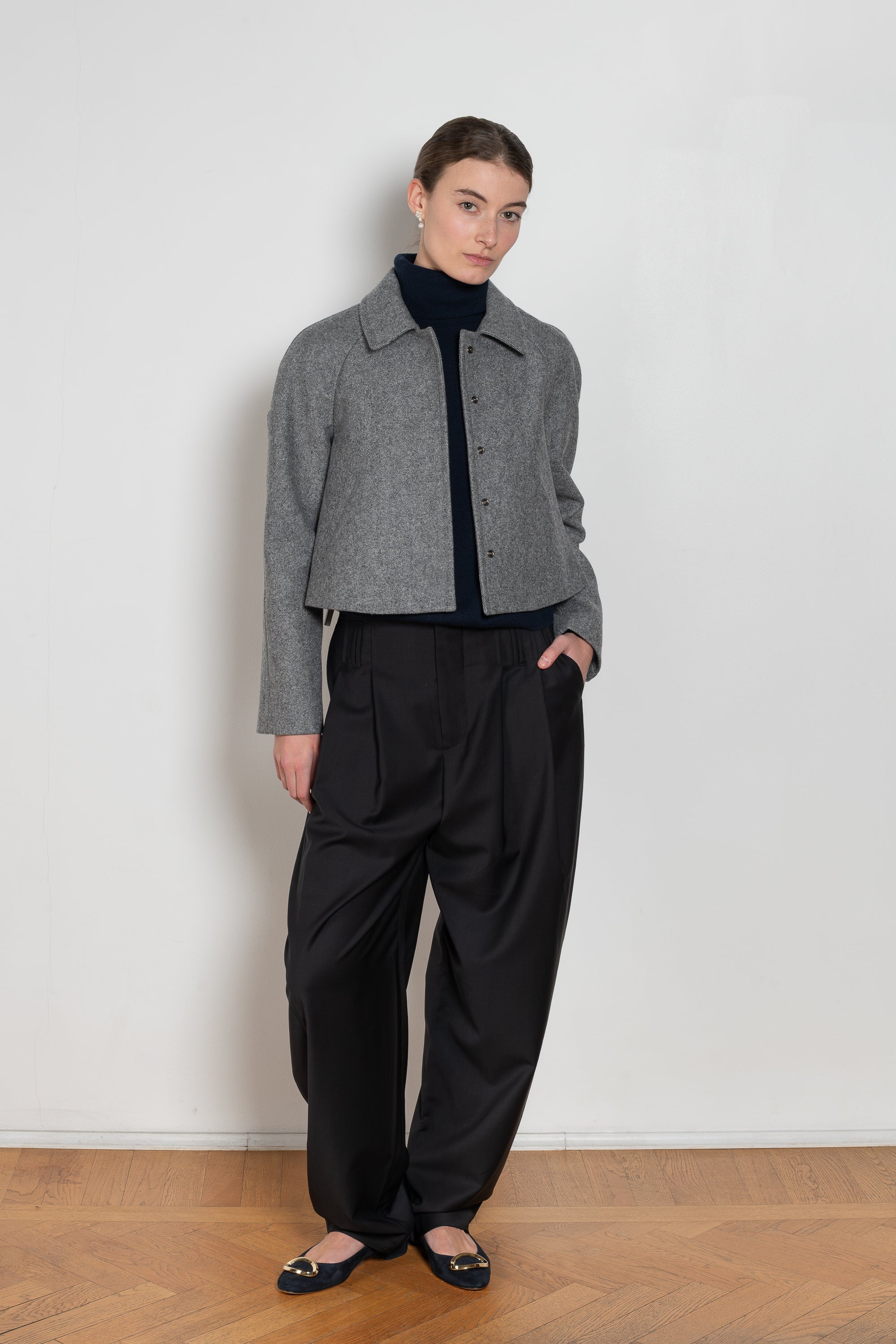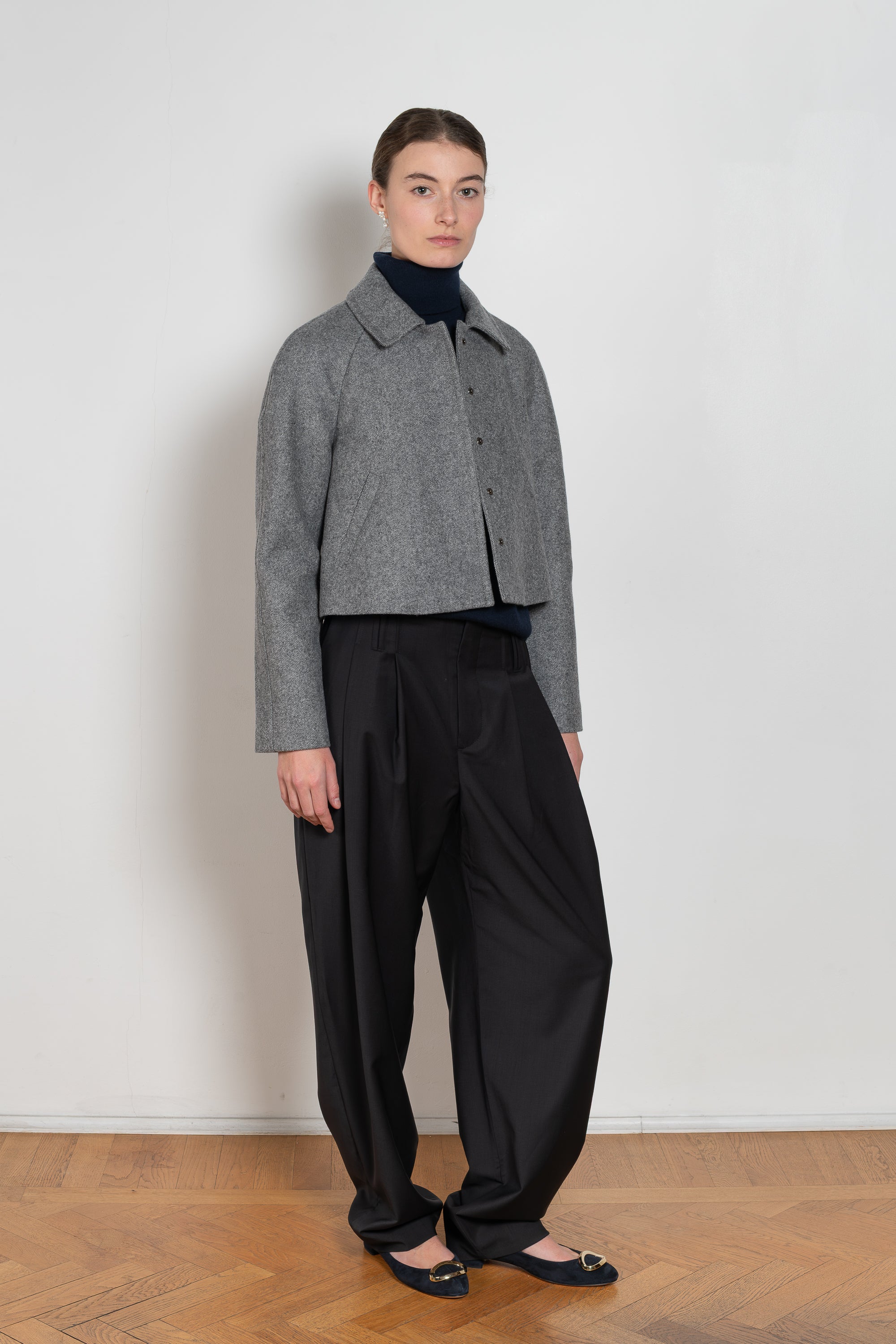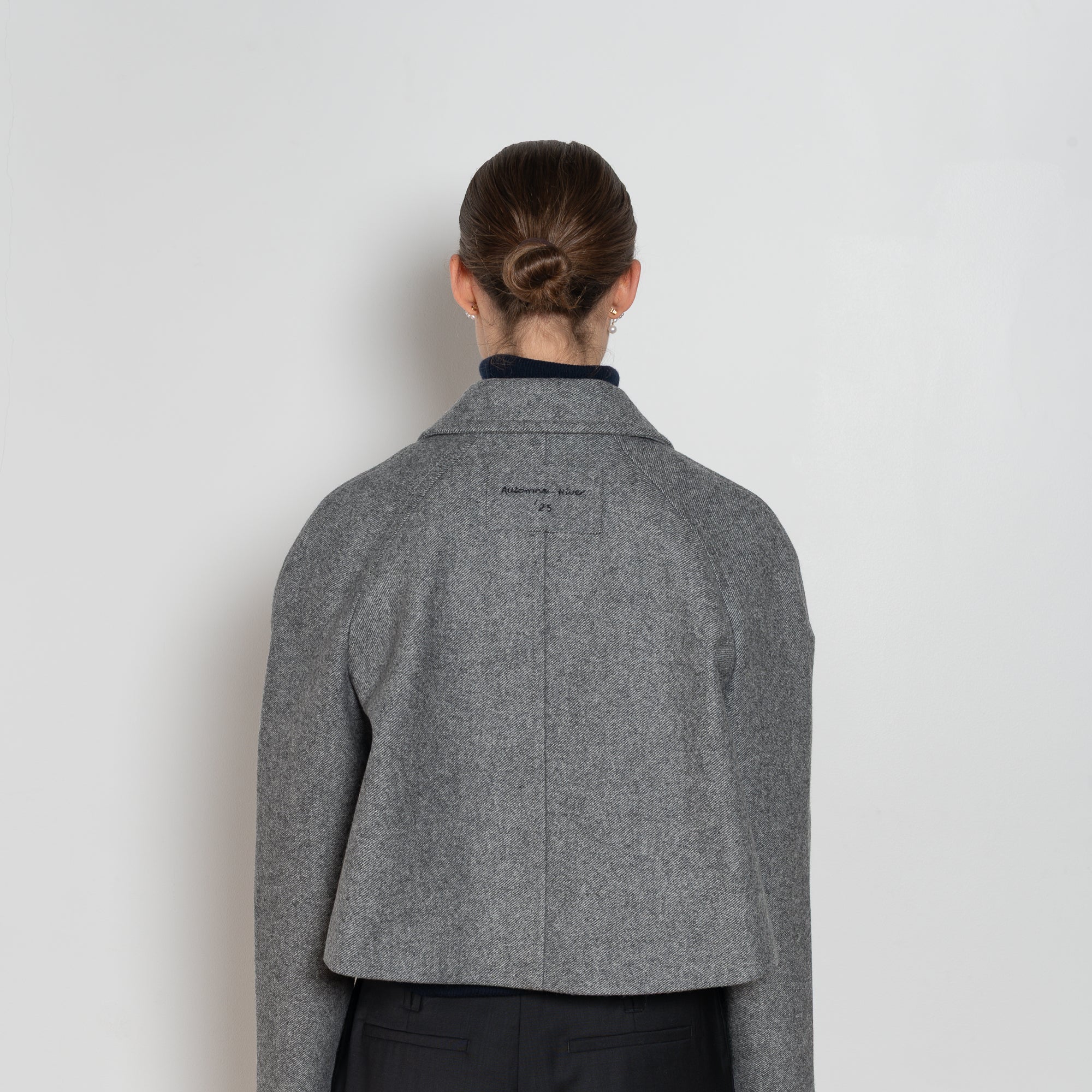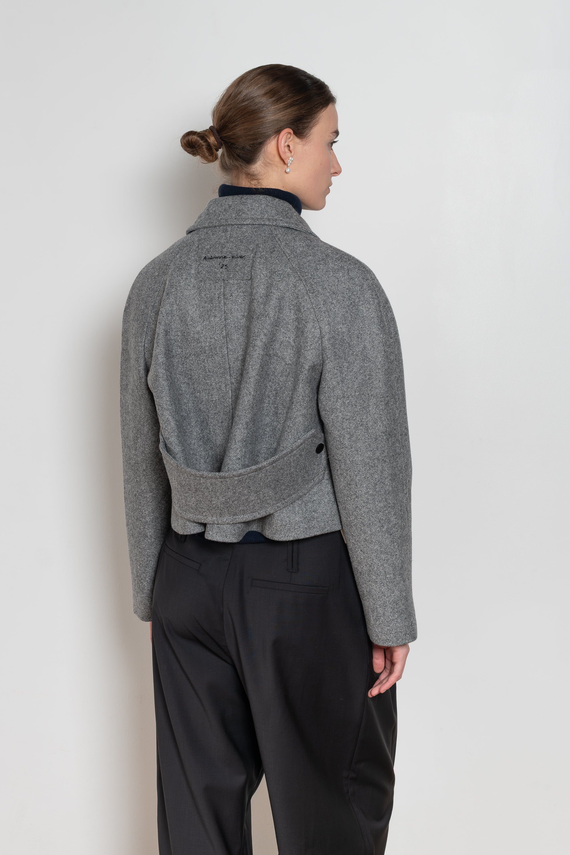 The Pixie Jacket by Nackiye is a little Crop Jacket with detachable back belt. The shoulder seam cuts across from the neck to under the arm, providing for an easier fit.