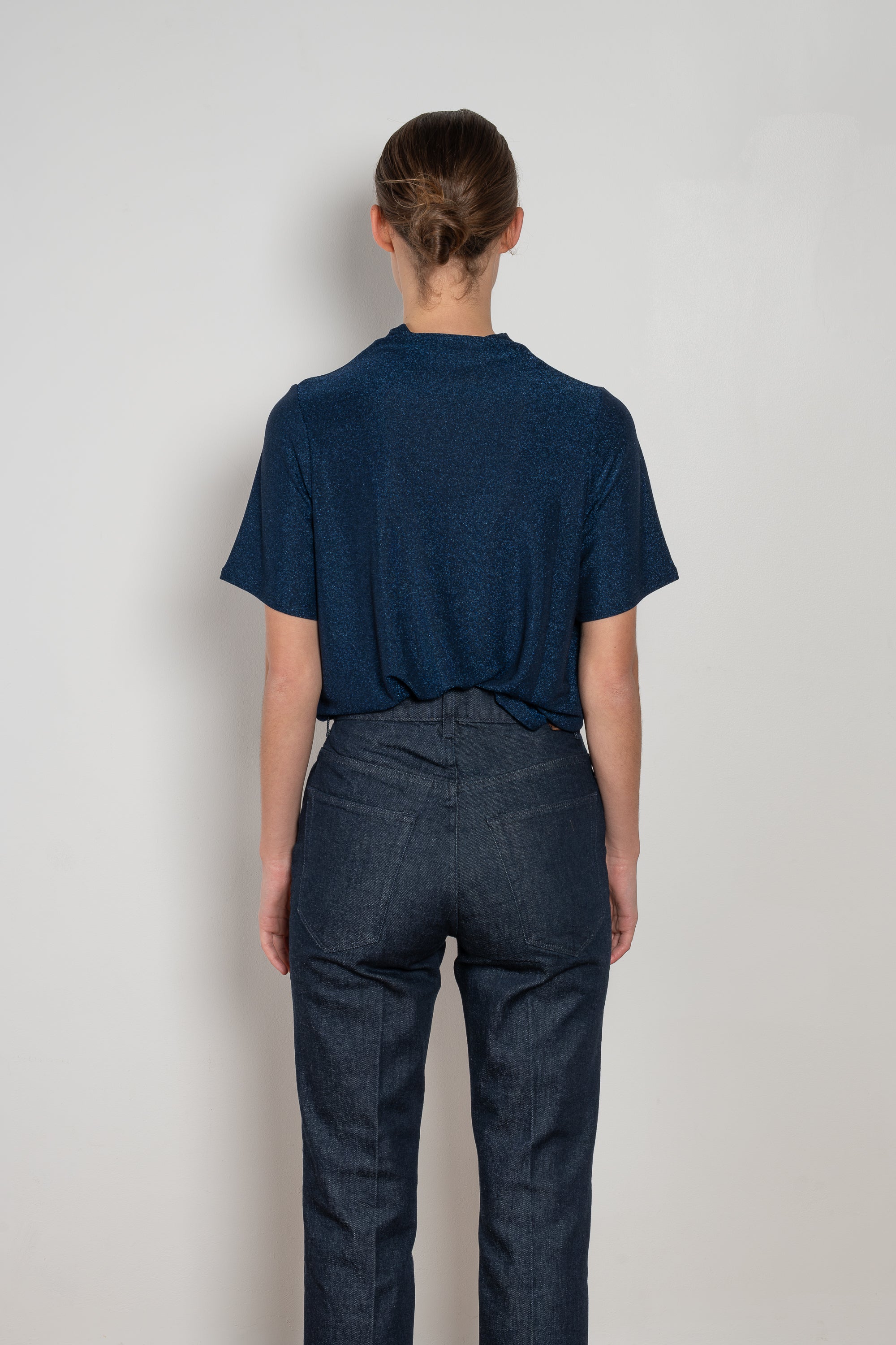 The Cowl Tee by Jamie Haller is a relaxed tee shirt shape with a built up neckline that drapes into a petite cowl. Tailored in Italian glitter knit jersey.