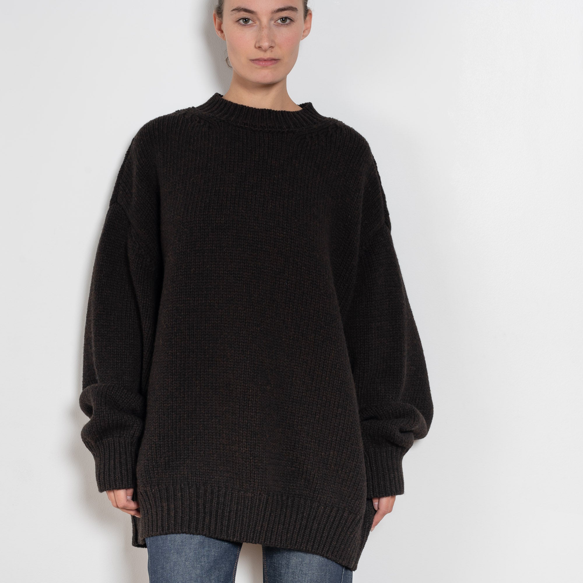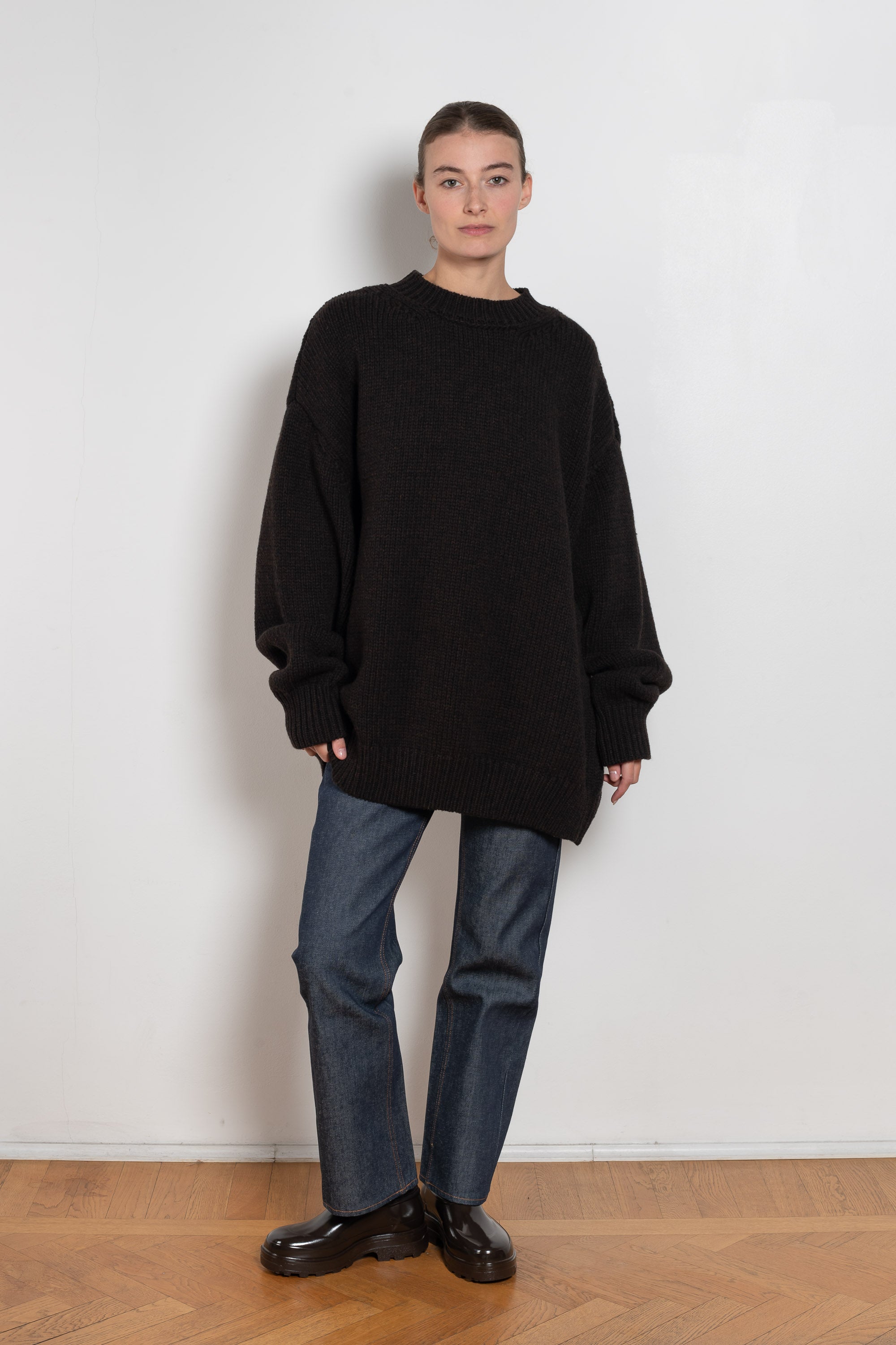 The Jumper by Maud Van Den Beussche knitted in Belgium from heavy-weight wool in a 2×2 rib knit. Designed with a round neckline, dropped shoulders, and rib trims at the cuffs, hemline, and collar, it features elongated sleeves and a generous body that form a cocoon-like silhouette. The dense knit construction gives it both weight and presence, while remaining comfortable and protective.