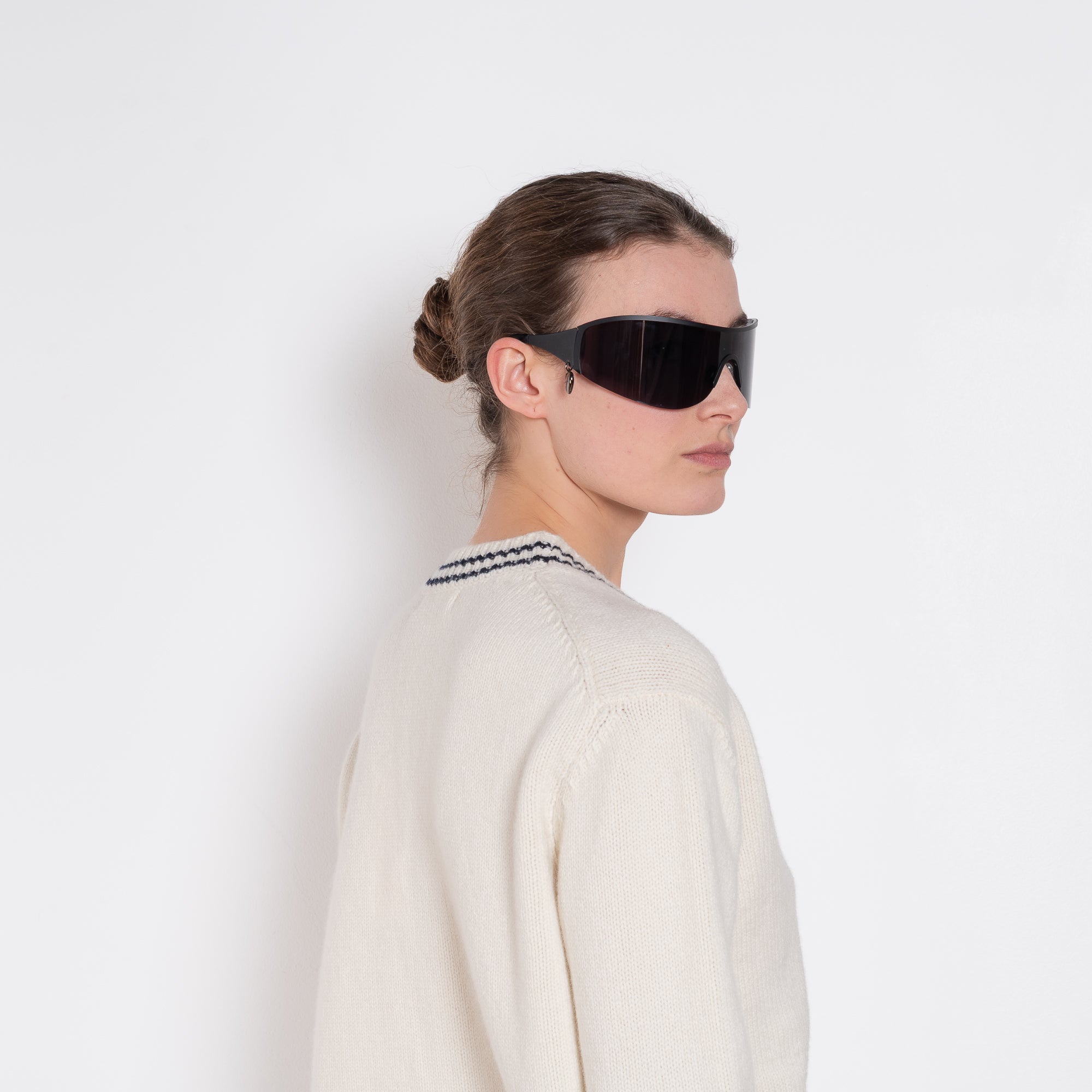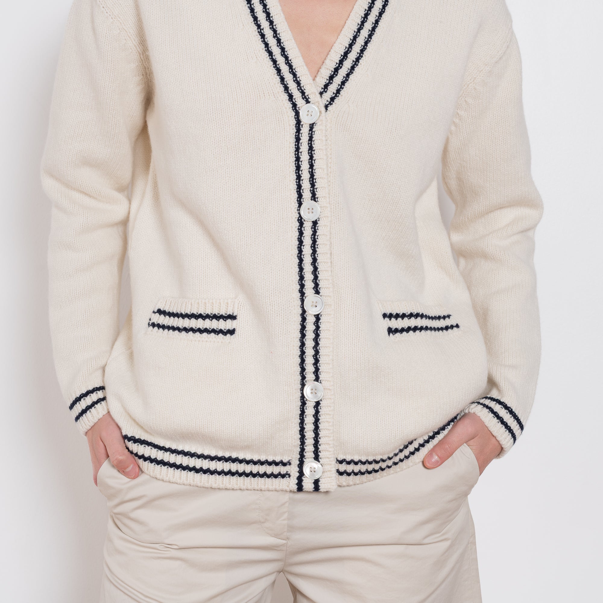 The Vneck Cardigan by & DAUGHTER in super-soft geelong lambswool, a modern take on a classic. With a gently contemporary sensibility, this mid-weight lambswool cardigan balances heritage detailing with everyday ease. Finished with a clean ecru base and signature navy stripe trim at the neckline, placket, hem and cuffs, and completed with responsibly sourced Trocas shell buttons.