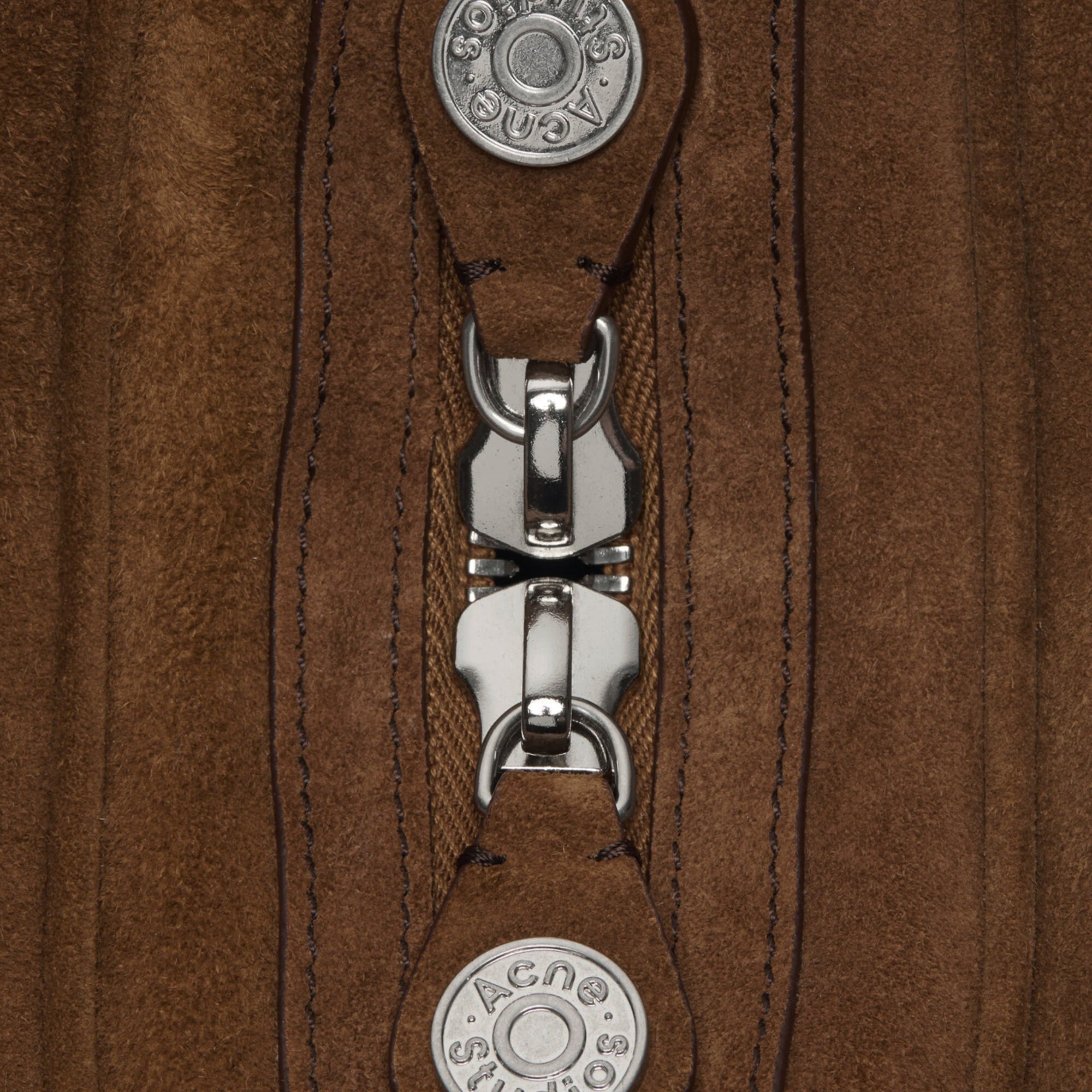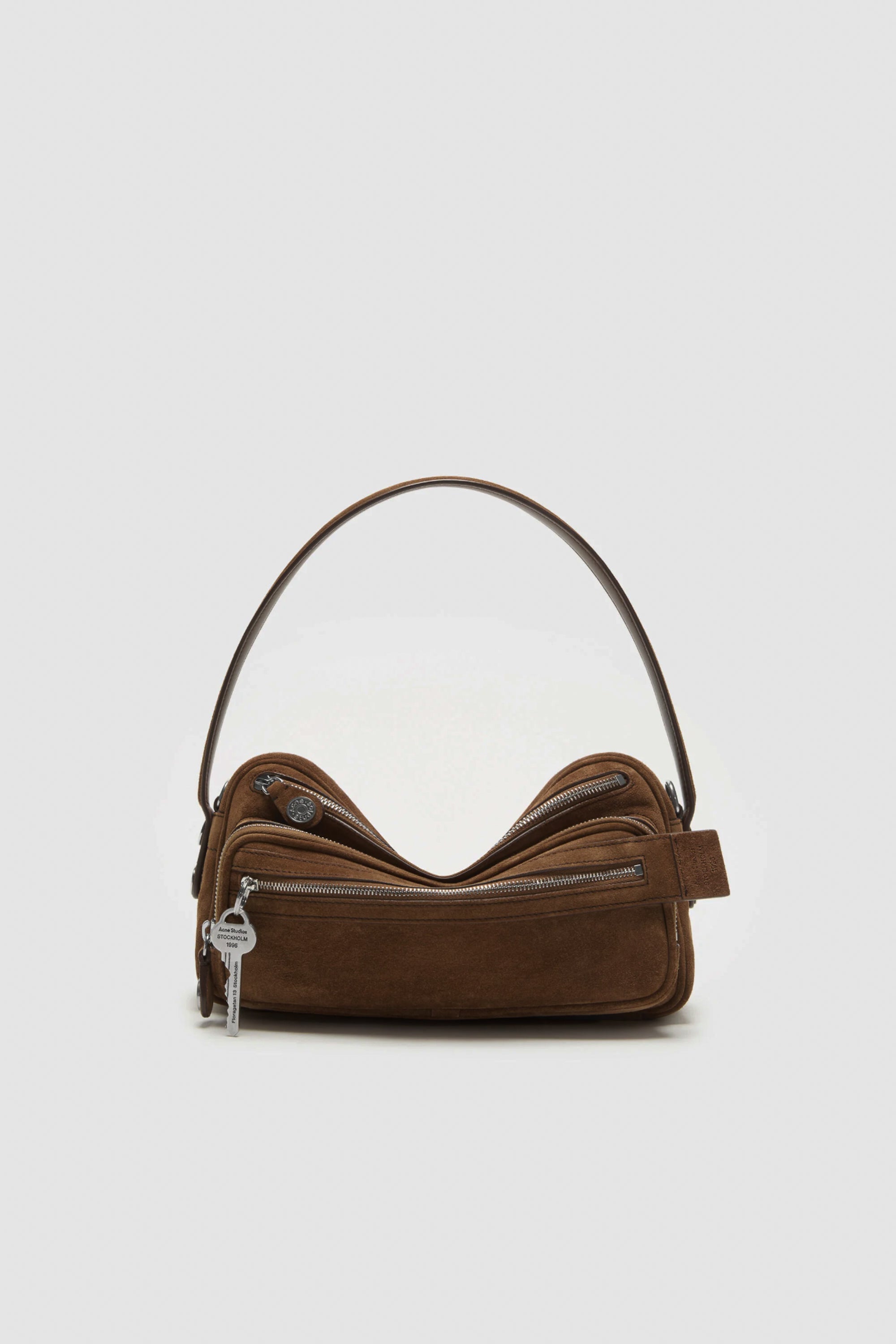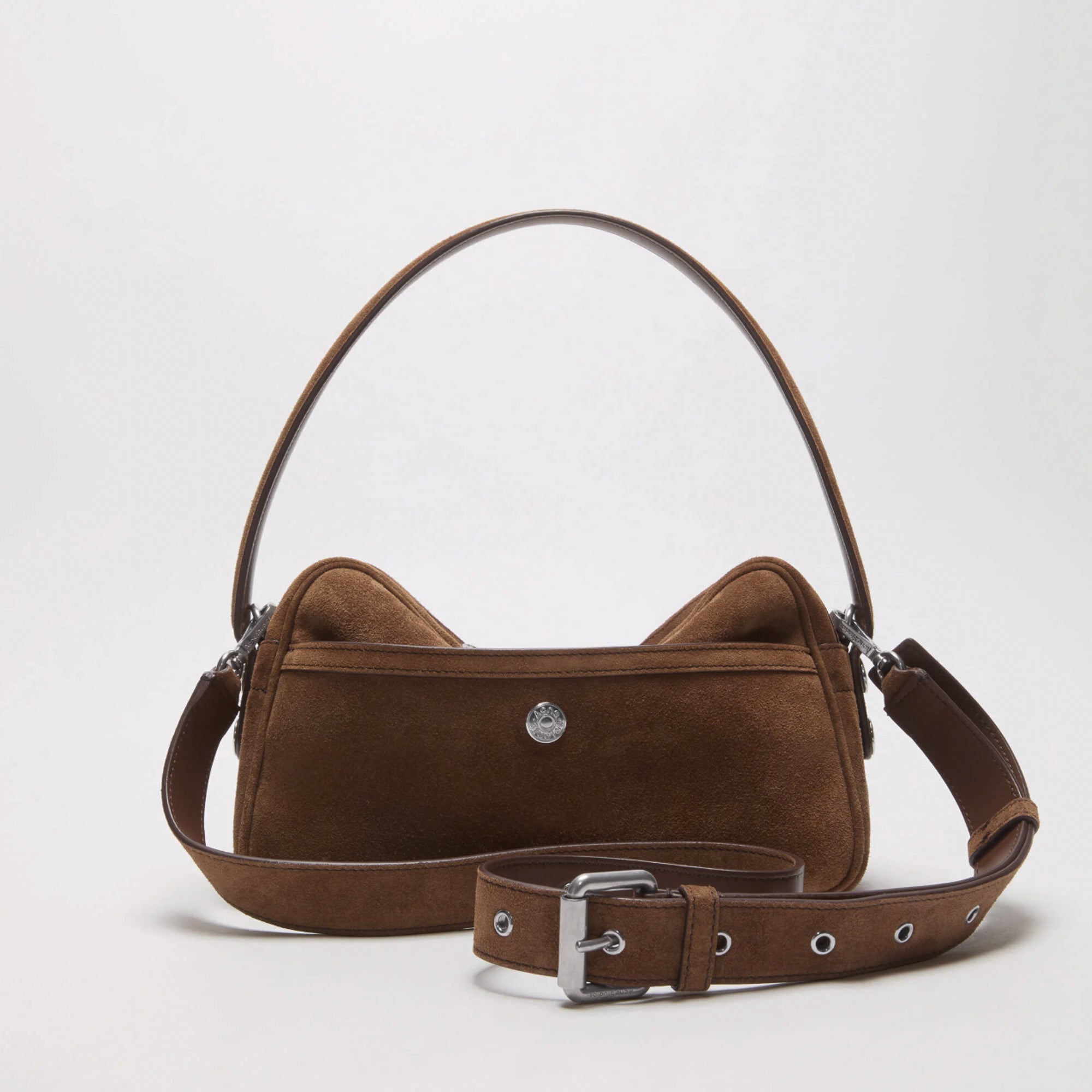 The Camero bag features a multipocket typology with a soft, rectangular design and a compact, structured silhouette. Crafted in soft suede. Accented with multiple zip compartments, branded key charm and signature denim-style button logo detail accents. Complete with a drop handle and adjustable crossbody strap for seamless wear.