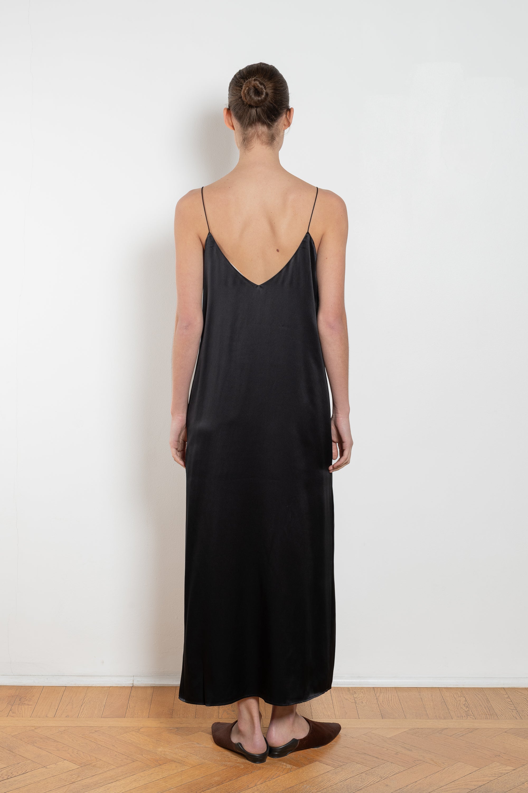 The Camisole Dress by Lisa Yang is crafted in 100% silk. The relaxed, longline silhouette is defined by slim shoulder straps, a deep v-neck and a subtle side slit.