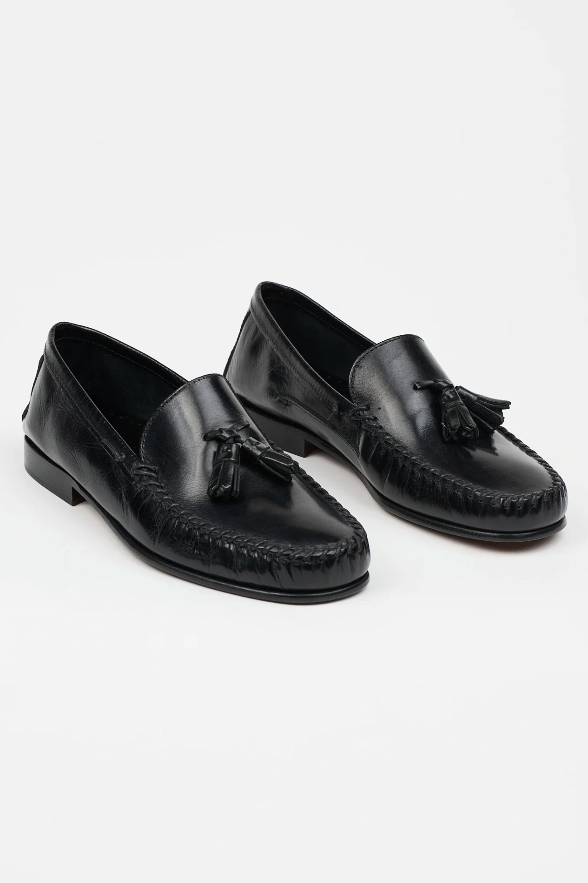The Tasselo Moc by Jamie Haller combines the classic iconicism of a Loafer and the bohemian spirit of a mocassin with playful leather tassel . Moccasin construction with an oiled leather sole and handmade in Italian Buffalo with a sturdy heel.
