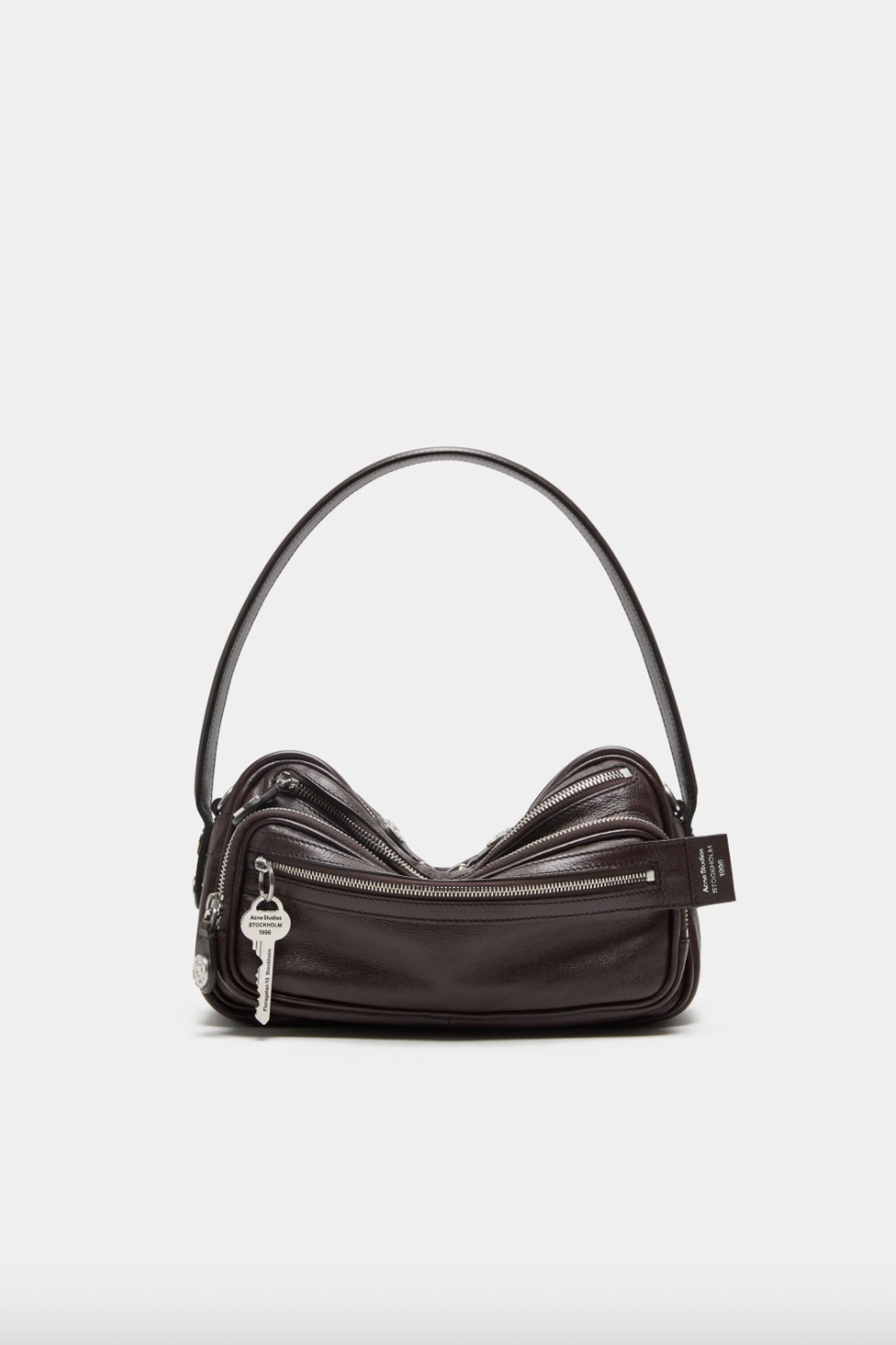 The Camero bag by Acne Studios features a multipocket typology with a soft, rectangular design and a compact, structured silhouette. Accented with multiple zip compartments, branded key charm and signature denim-style button logo detail accents. Complete with a drop handle and adjustable crossbody strap for seamless wear.
