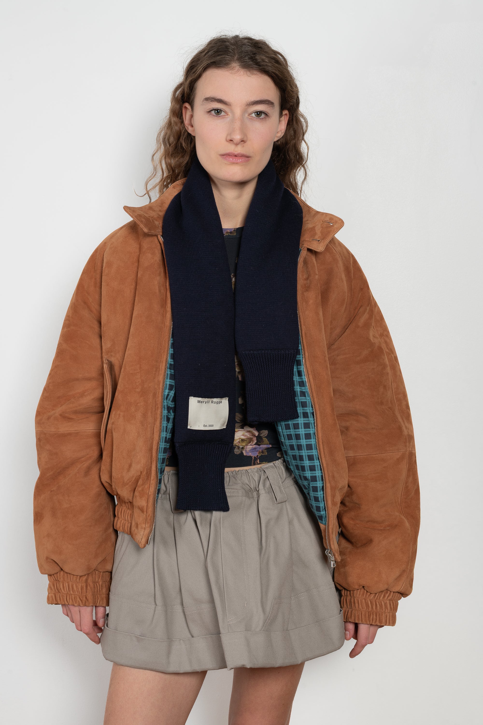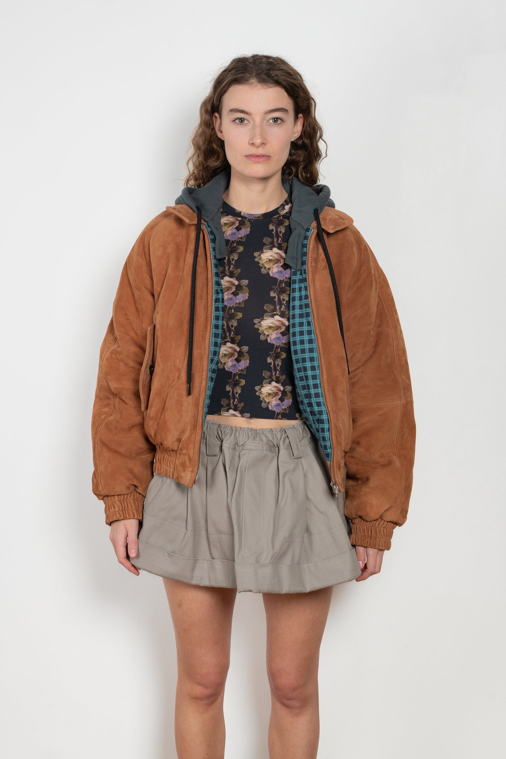 The Detachable Hood Suede Bomber by Meryll Rogge is an insulated lambskin suede bomber jacket. With elasticated waistband and removable jersey hood.