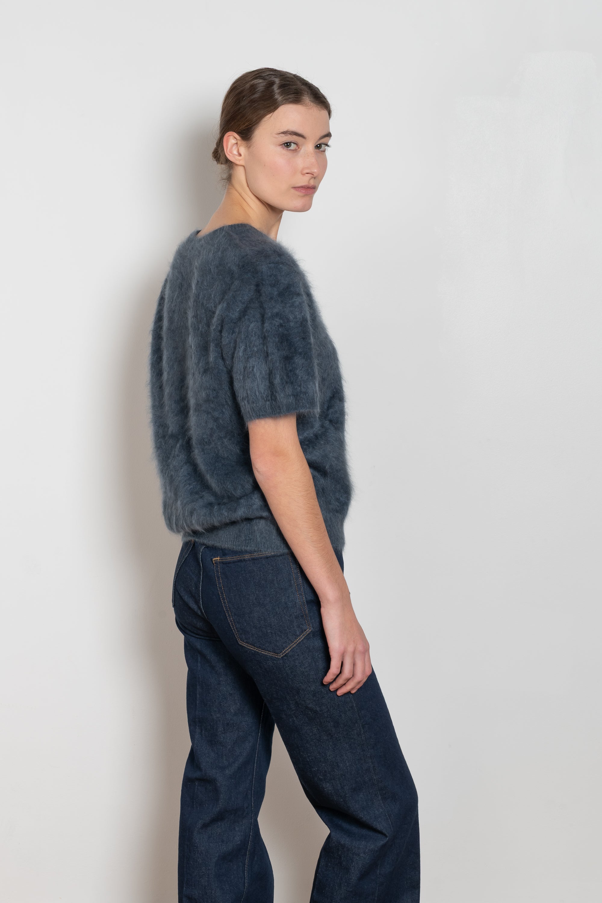 The Lovisa Sweater by LISA YANG is cloud-like in texture with a light and lofty feel. The regular fit silhouette is framed by a v-neck, short sleeves and a straight hem, neatly finished with ribbed edges.