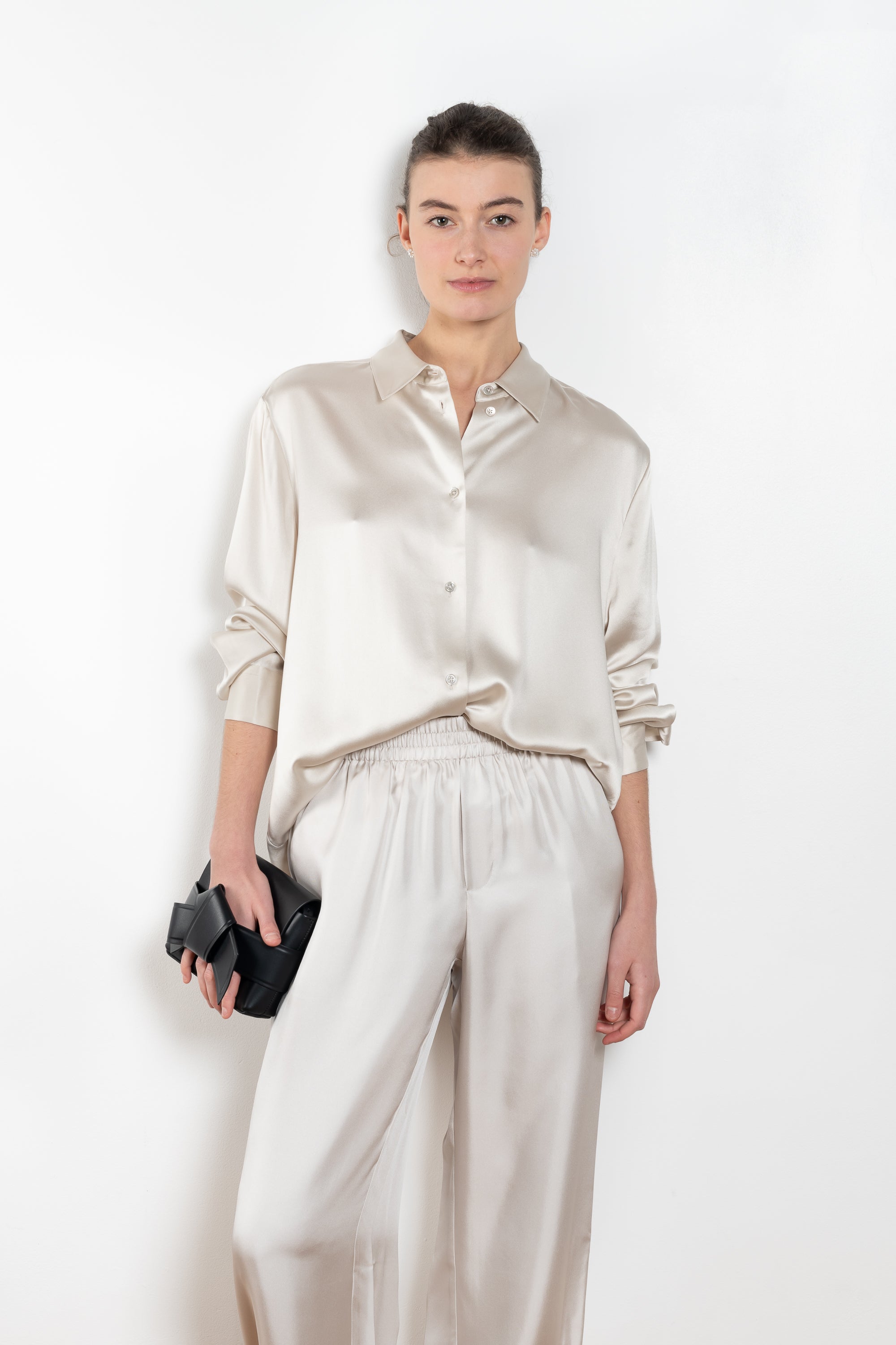The Long Sleeve Shirt by LISA YANG in a woven satin silk, has a neat collar, dropped shoulders, and a relaxed fit for a timeless yet modern take on silk shirting