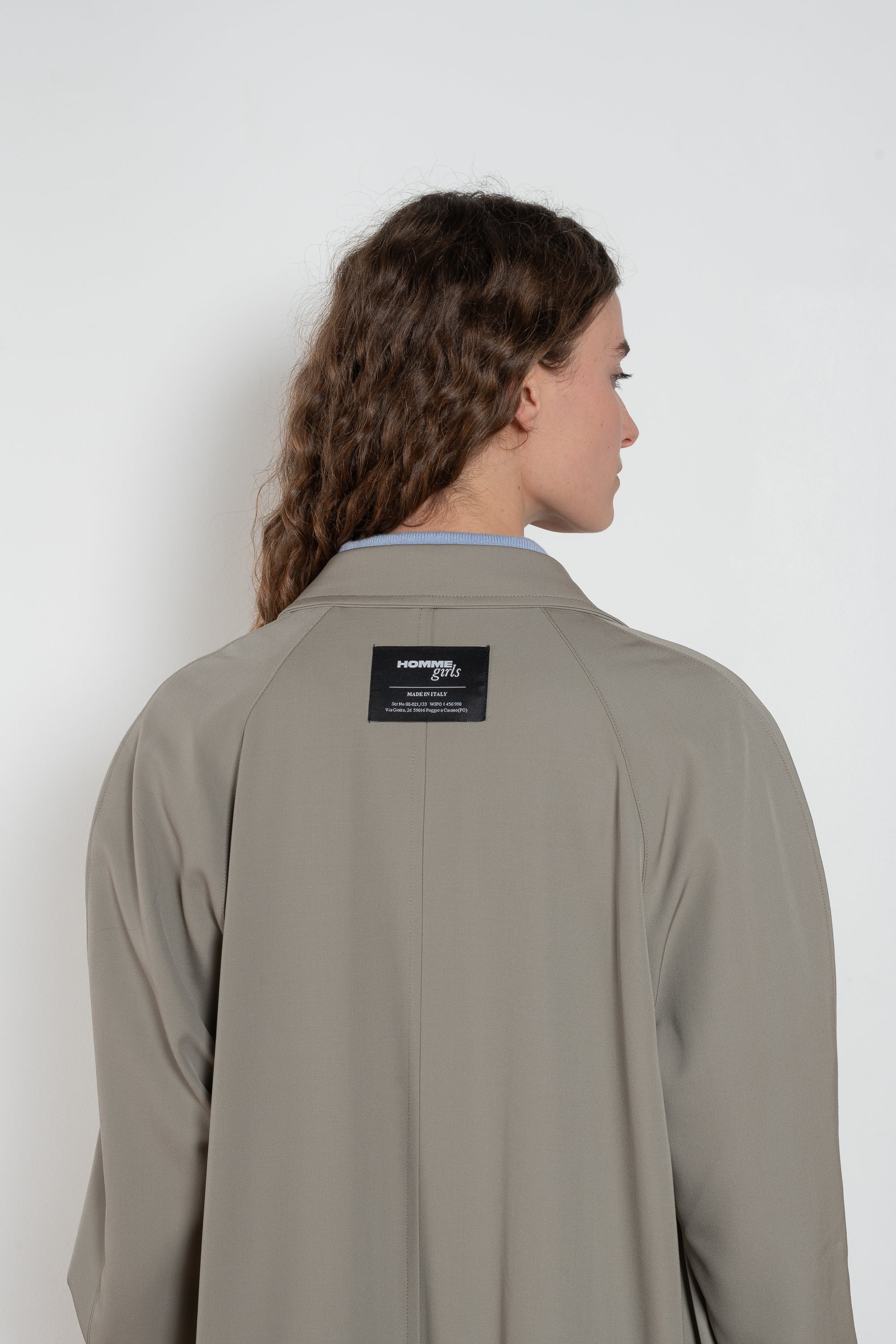 The Mac Coat by HommeGirls is a relaxed summer coat with collar. It is a straight long fit with one row of hidden buttons. Slit in back.